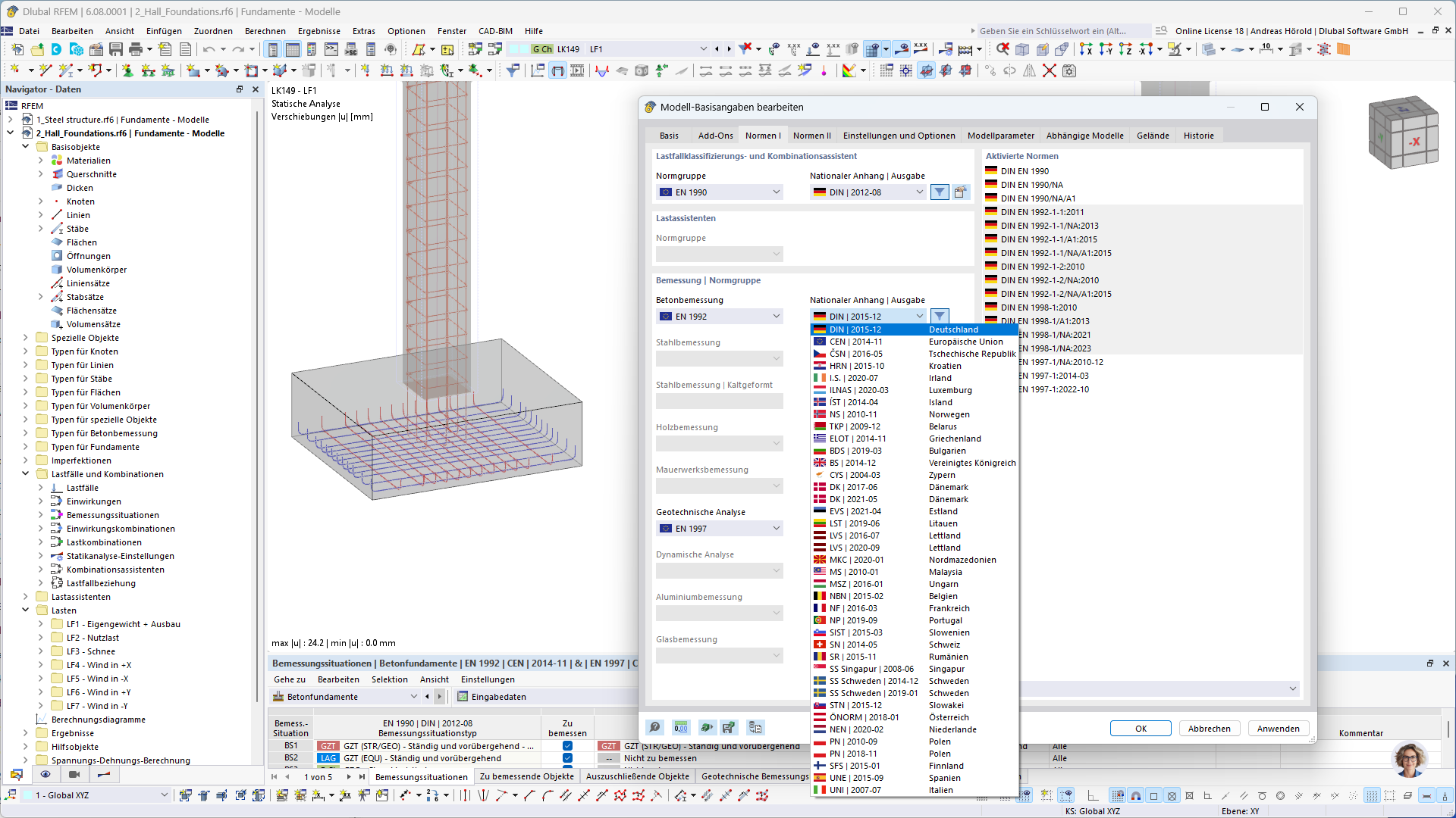 - Geotechnische Nachweise nach Eurocode 7 (Grundbruchnachweis, Gleitnachweis sowie Nachweise der Lagesicherheit, gegen Aufschwimmen, stark exzentrischer Belastung, Fundamentverdrehung)