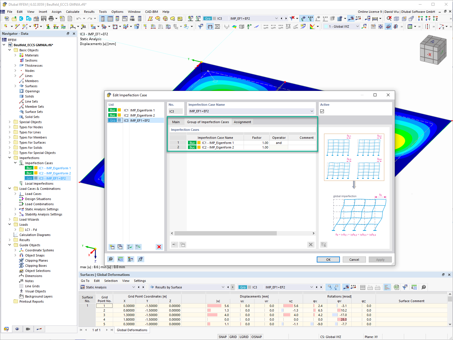 Graças a uma análise geométrica e material não linear incluindo imperfeições (GMNIA) no RFEM, obtém como resultado o comportamento estrutural "real", com o qual pode depois continuar a trabalhar.