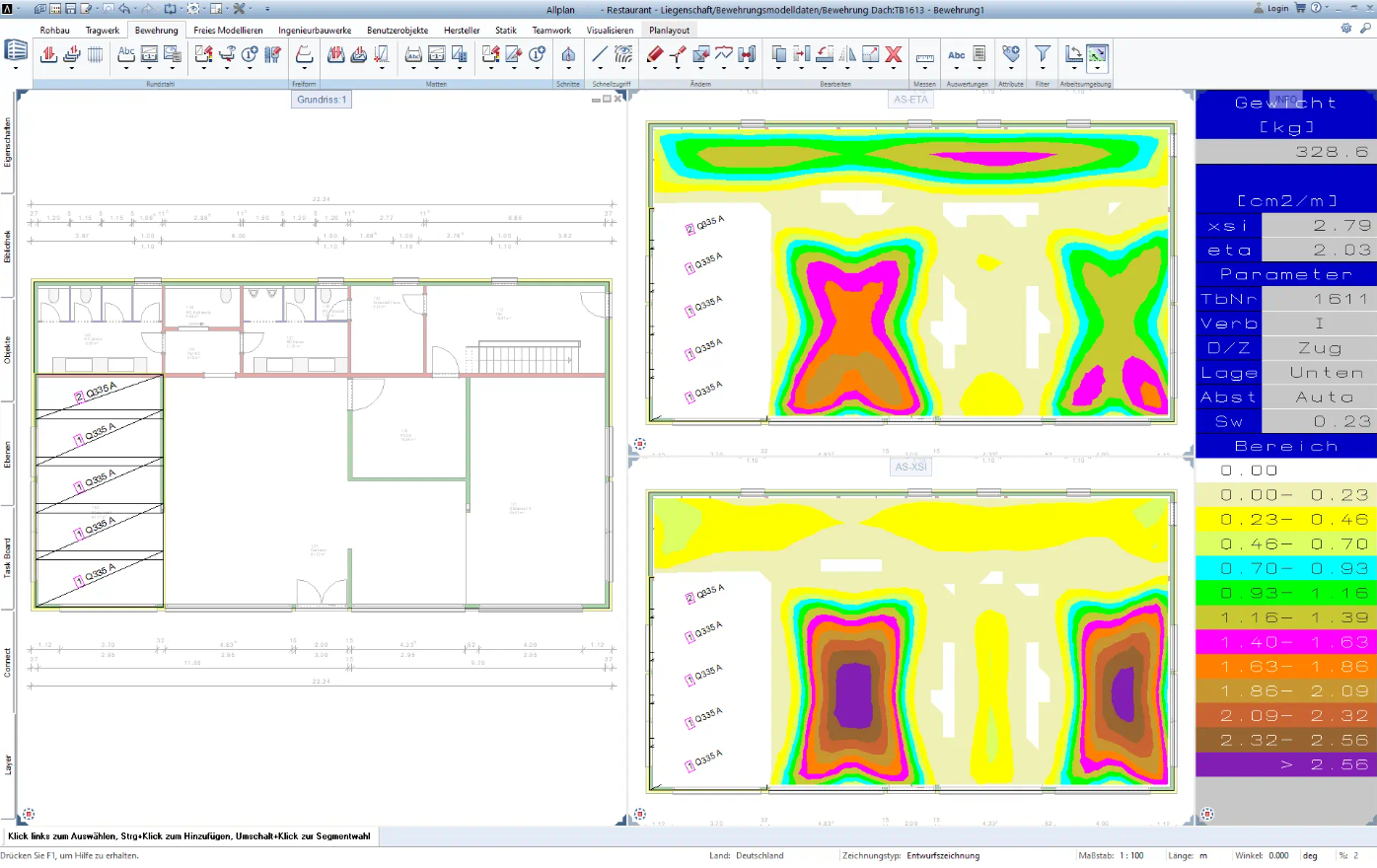 在附加模块混凝土设计中计算出的配筋可以通过ASF文件导出到Allplan。在Allplan中,可以显示配筋等高线或FEM配筋彩色图像。