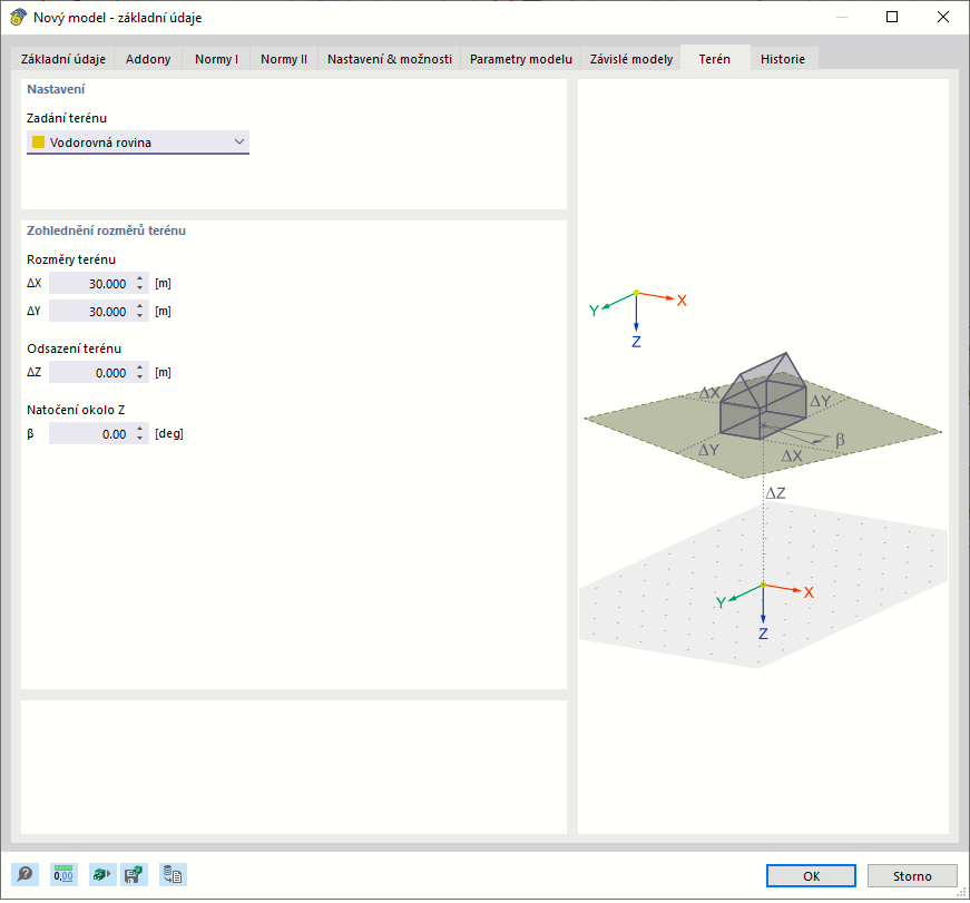 Dialog 'Nový model - základní údaje', záložka 'Terén'