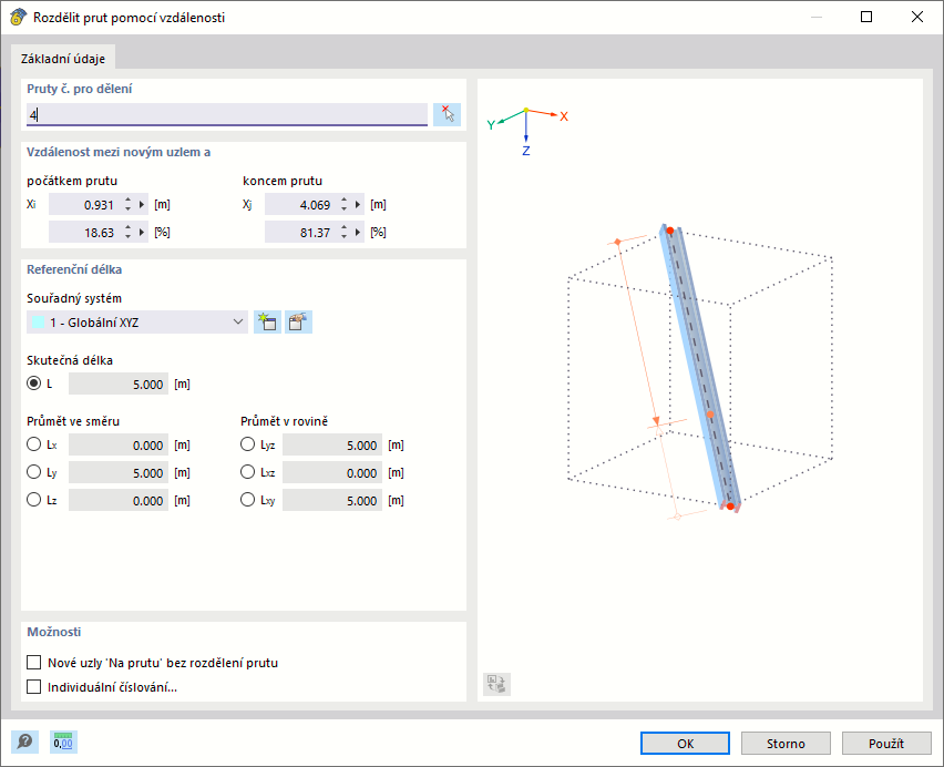 Rozdělení prutu ve vzdálenosti od počátku prutu