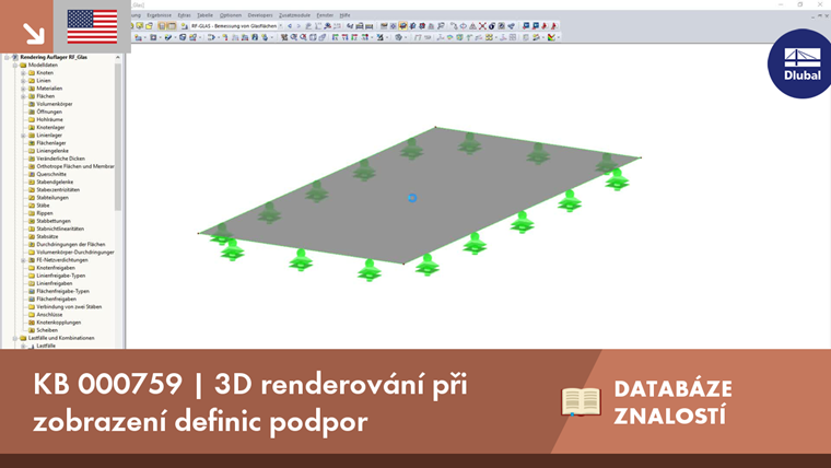 V přídavném modulu RF-GLASS je pro usnadnění stanovení podporových podmínek implementováno 3D renderování. Pomocí této interaktivní grafické vizualizace je umožněno uživateli snadněji zadávat a kontrolovat liniové a uzlové podpory. V případě potřeby však lze také zvolit schematické zobrazení.