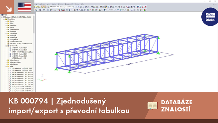 V těch lze snadno definovat popisy materiálů a průřezů pro import a export. Popisy vlastní softwaru Dlubal lze snadno vybrat z rozsáhlé databáze materiálů a průřezů. Tyto převodní tabulky lze v případě potřeby snadno sdílet na každém pracovním místě v kanceláři.