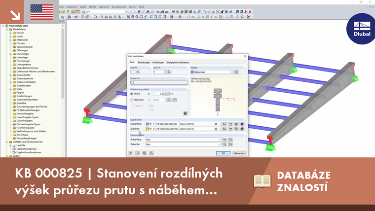 Pokud použijeme funkci „Spojit linie/pruty“ (výběrové okno přes danou část konstrukce), prut s náběhy se v uzlech 3 až 7 rozdělí. Správnou výšku průřezu program stanoví automaticky, takže ji uživatel nemusí předem zadávat. Pokud jsme na počátku prutu a na konci prutu s náběhem zadali různou excentricitu prutu, pak se také správně interpoluje v mezilehlých uzlech.