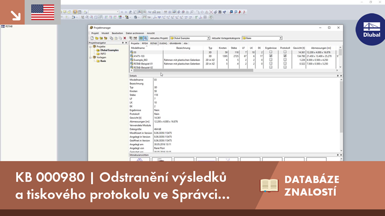 Za účelem odstranění problémů způsobených výsledkovými daty nebo daty tiskového protokolu, která nejsou čitelná, lze vymazat tato data ve Správci projektů, aniž by bylo nutné otvírat daný projekt. Data konstrukce, zatížení a definované kombinace zůstanou zachovaná.