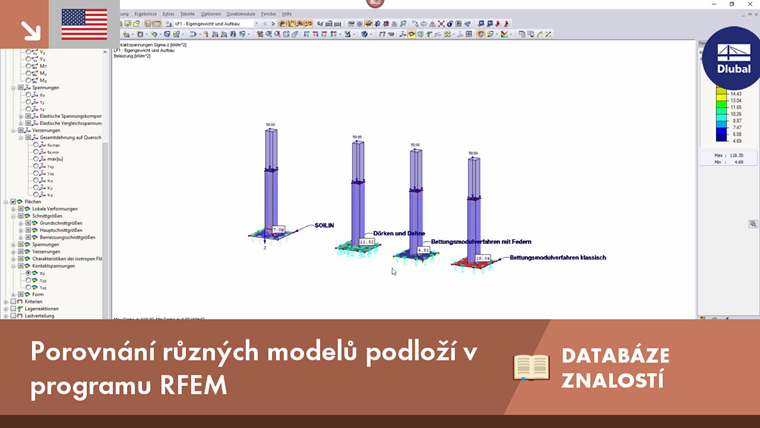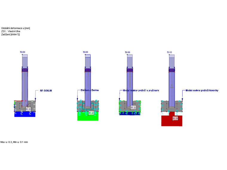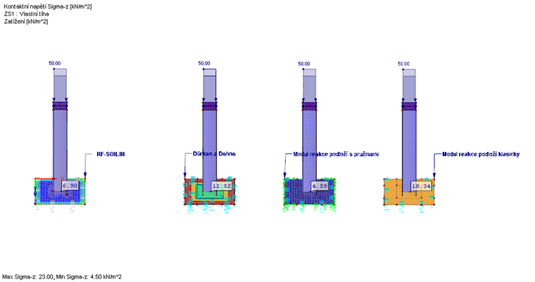 U všech tří výpočetních metod, které usilují o realističtější model podloží, se okrajová tuhost zvyšuje. Dosáhneme tak často výrazně lepších výsledků. Na našem příkladu vidíme, že se kontaktní napětí a deformace liší v závislosti na použité metodě. Čím jsou spočítané hodnoty podloží přesnější, tím více se kontaktní napětí blíží kontaktním napětím stanoveným v modulu RF-SOILIN.