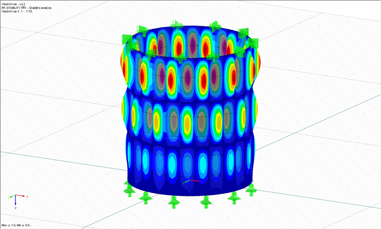 Následuje lineární analýza rozdvojení tvaru. Pořadí analýz jsme přitom zvolili náhodně. Postupovat můžeme i opačně, tedy provést nejdříve tuto analýzu a následně pak analýzu MNA. Při lineární analýze rozdvojení tvaru rovněž chceme stanovit součinitel kritického zatížení, tentokrát se ovšem jedná o faktor, při kterém dochází k boulení skořepiny bez imperfekcí. Je přitom nezbytné mít k dispozici přídavný modul RF-STABILITY, který slouží k lineárním analýzám rozdvojení tvaru i ke geometricky nelineárním výpočtům, čímž nemáme na mysli výpočty GMNIA. Na obr. 03 je znázorněn první vlastní tvar posuzované skořepiny pro vlastní hodnotu rRcr = 7,70.