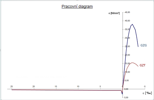 Charakteristický průběh pracovního diagramu se použije pro posouzení mezního stavu použitelnosti. Při nelineárním výpočtu mezního stavu únosnosti se má podle kap. 5.7 DAfStb [1] vycházet z následujícího vztahu: