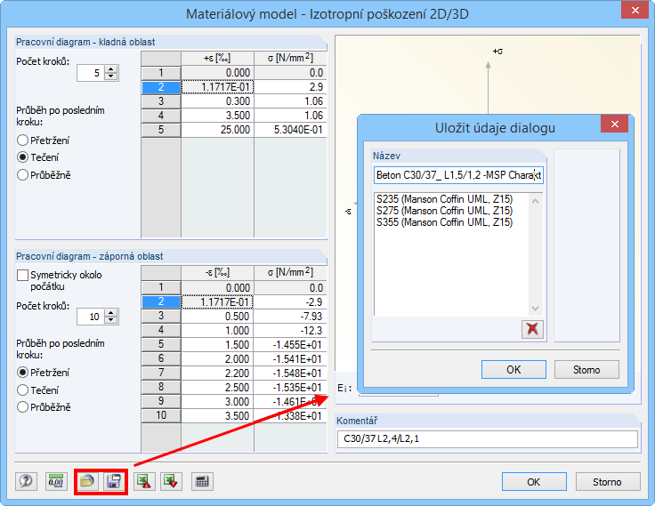 Zadané pracovní diagramy lze v programu RFEM uložit a znovu je použít v jiných projektech. Můžeme si tak vytvořit pro drátkobeton vlastní databázi materiálů.