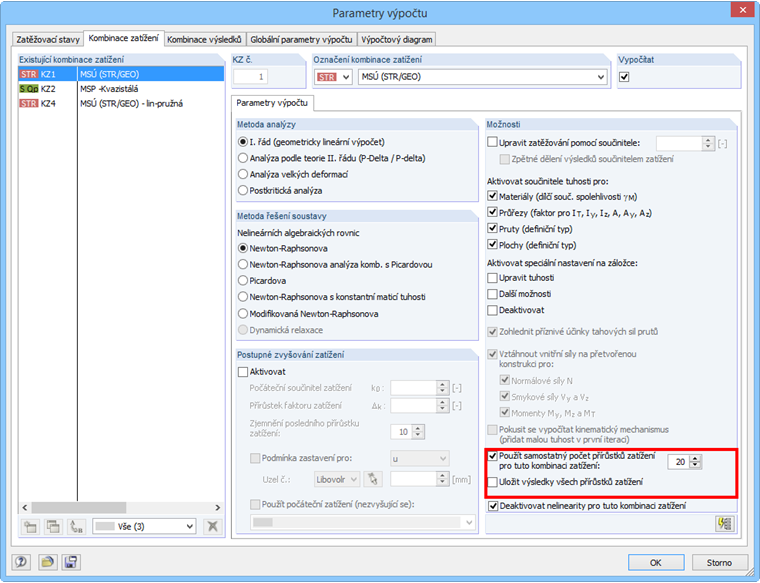 Vzhledem k výrazné nelinearitě by se mělo zatížení uvažovat v postupných přírůstcích. Počet přírůstků zatížení by se měl přitom zvolit tak, aby systém zůstal při prvním přírůstku zatížení v lineárně pružném stavu. Zlepší se tak konvergence výpočtu. Počet přírůstků zatížení lze nastavit globálně v parametrech výpočtu anebo také lokálně u každé kombinace zatížení, respektive u každého zatěžovacího stavu zvlášť. Pro návrhové zatížení v mezním stavu únosnosti se u výše uvedené základové desky ukázalo jako výhodné zadat pro iteraci 20 přírůstků zatížení. Těchto 20 přírůstků zatížení jsme zadali lokálně u kombinace zatížení (obr. 08).