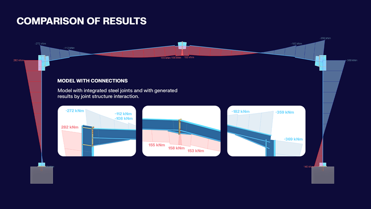 Funkce polotuhých kloubů funguje tak, že se klouby integrují do globálního modelu před výpočtem vnitřních sil na základě počáteční analýzy tuhosti. Proces začíná tím, že addon Ocelové přípoje automaticky generuje tyto polotuhé přípoje, které odrážejí skutečné podmínky tuhosti přípojů. Tato funkce odstraňuje nutnost ručního a časově náročného zadávání tuhosti a místo toho umožňuje uživatelům soustředit se na celkové posouzení svých konstrukcí s vědomím, že chování spoje je přesně zachyceno.