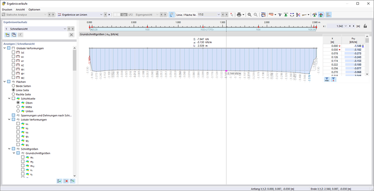 Pro ilustraci je průběhové nosníkové systémy porovnáno s jedno-pólovým systémem horního nosníku. Pro kombinaci zatížení 2 (1,35*LF1) vzniká maximální normální síla -4,7 kN pouze z vertikálního zatížení 6,75 kN/m. Na obrázku jsou síly znázorněny jednou s přihlédnutím k průběhovému účinku a jednou bez. Na levé straně normální síly a ohyb s průběhovým účinkem, vpravo bez. Na levé straně obrázku jsou patrné podpěrné momenty.