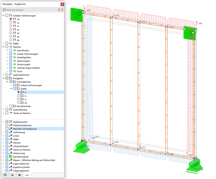 Vertikální zatížení je zavedeno na horní nosník 3D modelem. V důsledku průběhového účinku nevzniká ručně vypočítaná normální síla 6,75 kN/m x 0,625 m = 4,22 kN.
