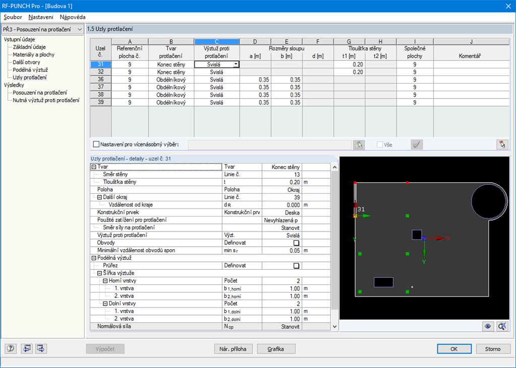 Po otevření modulu se přednastaví materiály a tloušťky ploch definované v programu RFEM. Uzly, které se mají posoudit, jsou rozpoznány automaticky, ale uživatel je může také upravit.