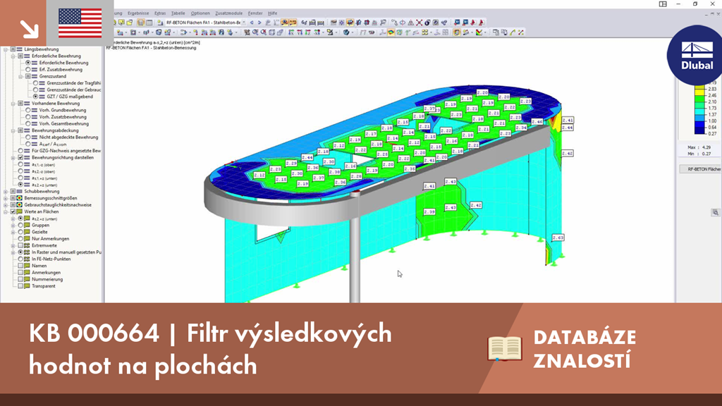 V mnoha případech je potřeba filtrovat výsledky pro zobrazení hodnot na plochách, aby se nezobrazila všechna čísla. Při zobrazení uspořádání výztuže můžete například skrýt hodnoty, které jsou nižší než použitá základní výztuž.