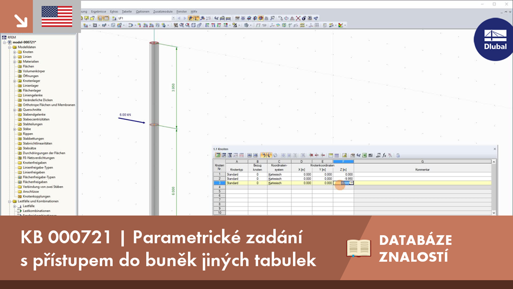 Modely a zatížení lze definovat nejen graficky nebo v tabulkách, ale lze je také definovat parametry (viz manuál). Pomocí parametrického zadání lze také přistupovat k buňkám určitých tabulek programu. Tímto způsobem je například možné spojit parametr zatížení s parametrem dat modelu. Odkaz se zapisuje znakem $.