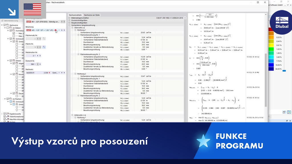U posouzení konstrukcí ze železobetonu, oceli, dřeva, hliníku atd. se podrobně zobrazí vzorce použité pro posouzení (včetně odkazu na použitou rovnici z normy). Tyto vzorce lze vložit také do tiskového protokolu.