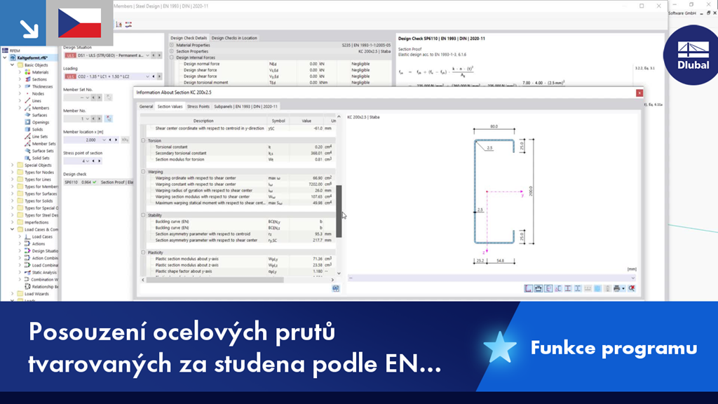 Jak pro profily tvarované za studena z databáze průřezů, tak pro obecné (neděrované) za studena tvarované profily zadané v RSECTION vám náš program pomůže stanovit účinný průřez se zohledněním lokálního a distorzního boulení. Provést zde lze také posouzení průřezu podle EN 1993-1-3, 6.1.6. Přitom se zohlední vnitřní síly z výpočtu s vázaným kroucením (7 stupňů volnosti) v posouzení srovnávacího napětí.