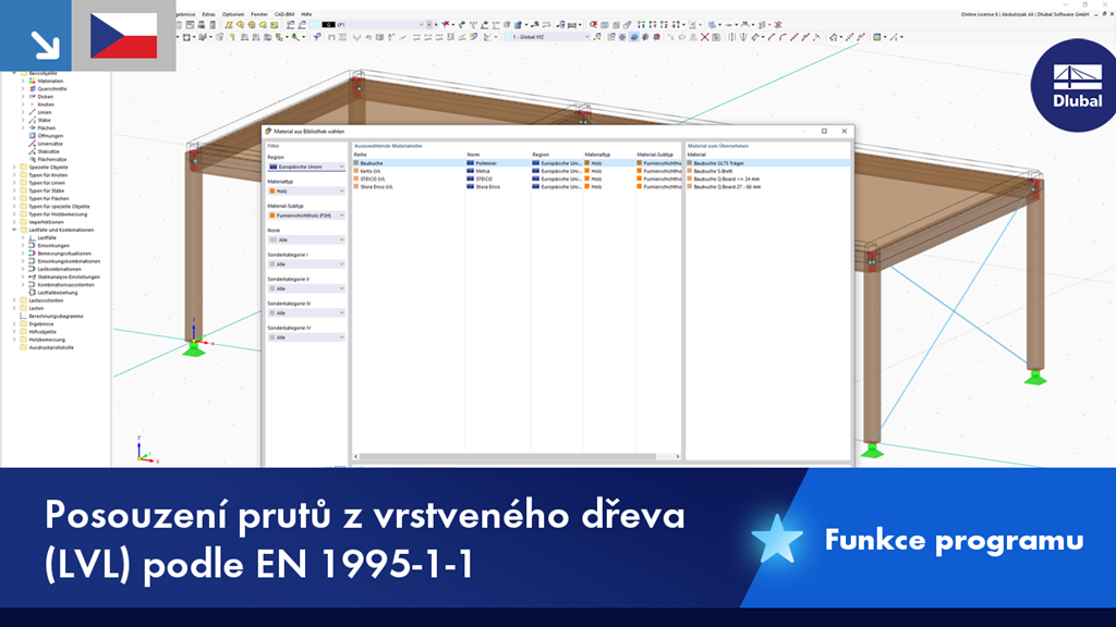 V programech RFEM a RSTAB lze posuzovat pruty s typem materiálu 'Vrstvené dřevo'. K dispozici jsou materiály následujících výrobců: