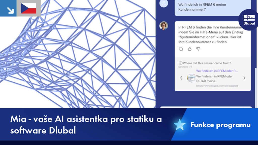 Mia je AI asistentka společnosti Dlubal, kterou máte k dispozici nejen na webových stránkách, ale také přímo v programech RFEM, RSTAB a RSECTION.