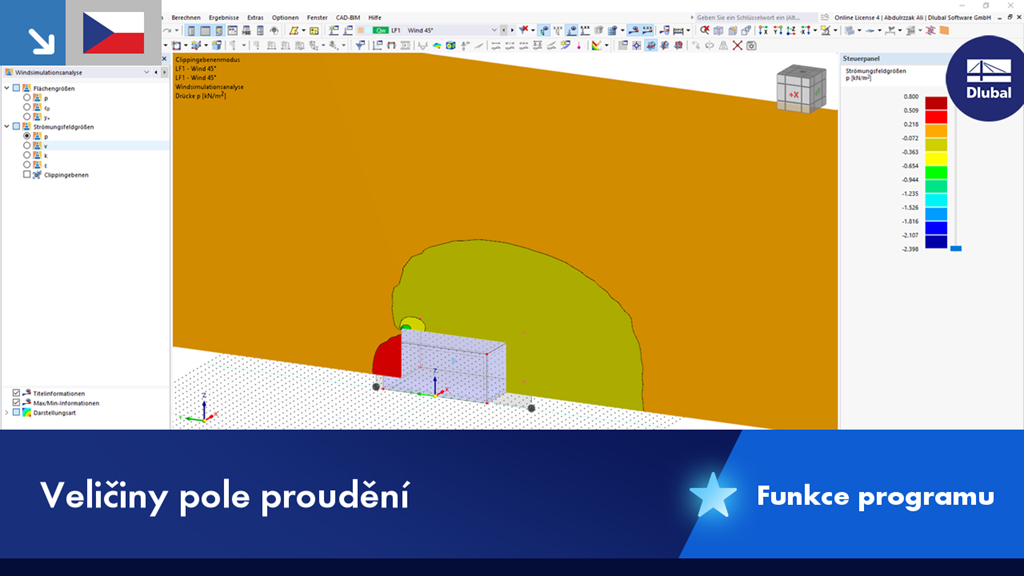 V programech RFEM a RSTAB máte možnost nechat si zobrazit veličiny pole proudění pro simulaci větru, jako tlak, rychlost, kinetickou energii turbulence a míru disipace proudění.