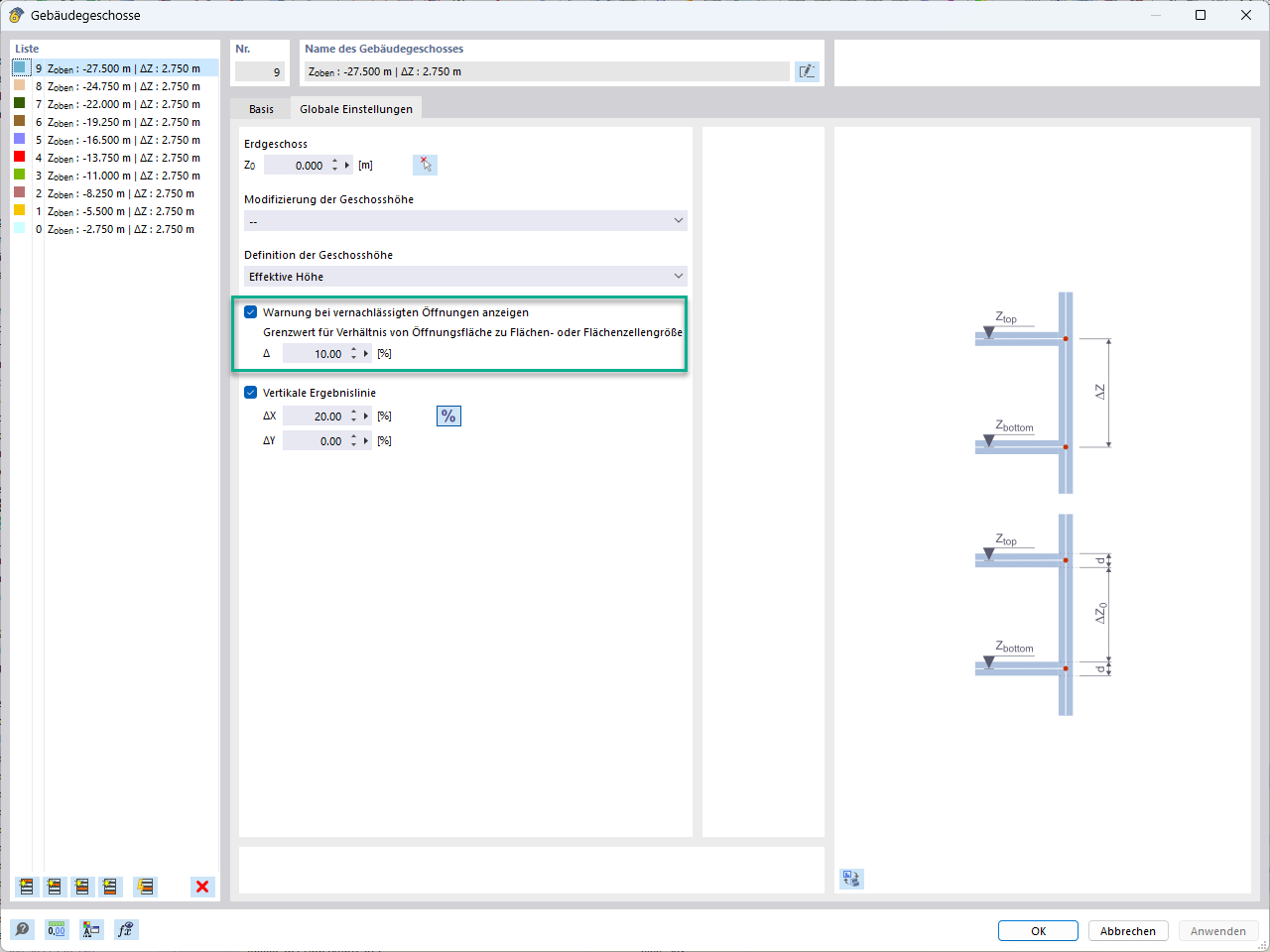 Otvory s určitou plochou můžete při výpočtu modelu budovy zanedbat. Tuto funkci lze aktivovat v globálním nastavení pro podlaží budovy.