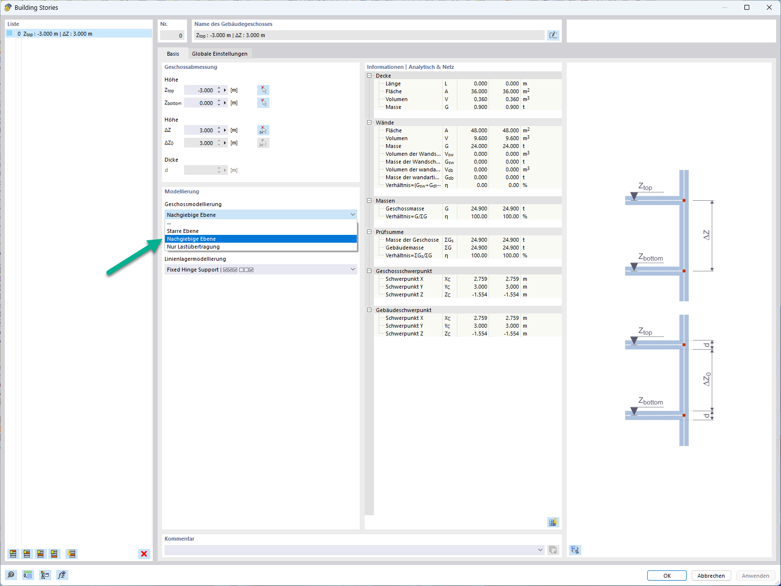 Výpočet modelu budovy umožňuje podle modelování podlaží diferencované zobrazení výsledků. Nejprve se vytvoří 3D model, kde jsou stropy modelovány buď jako tuhé plošiny, nebo jako pružné plošiny. To umožňuje posouzení podobné analýze jednotlivých pozicí, která však nezanedbává účinky 3D modelu.