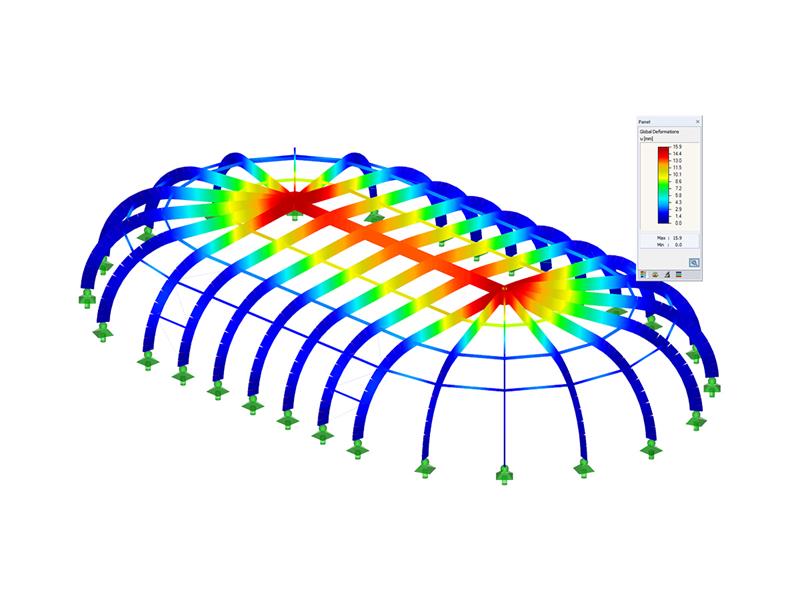 V programu RFEM lze skleněné konstrukce navrhovat a posuzovat samostatně nebo jako část celého modelu. Rozsáhlá databáze materiálů obsahuje velké množství běžných typů skel, fólií a plynů.