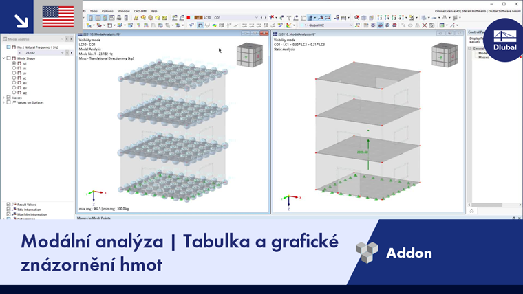 Hmoty, které se použijí pro modální analýzu, můžete zkontrolovat po výpočtu v tabulkové i grafické podobě.