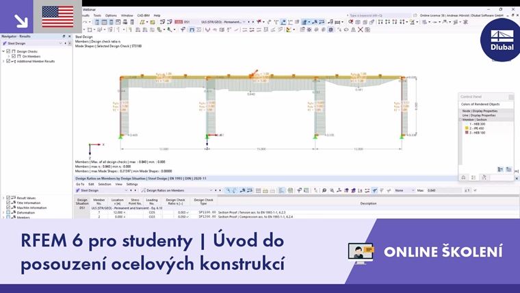 Pokud jste aktivovali návrhový addon pro Posouzení ocelových konstrukcí a nastavili normu, uživatelské prostředí se rozšíří o nové položky v navigátoru, tabulkách a dialozích. Parametry posouzení ocelových konstrukcí jsou tak plně integrovány do programu. Tím se zpřístupní vlastnosti posouzení pro všechny pruty a sady prutů, které používají materiál typu ocel.