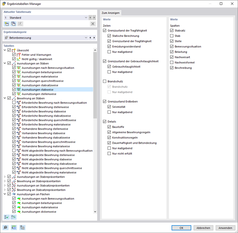 Nach der Berechnung der Ergebnisse enthält die Tabellenkategorie Betonbemessung neue Unterkategorien.