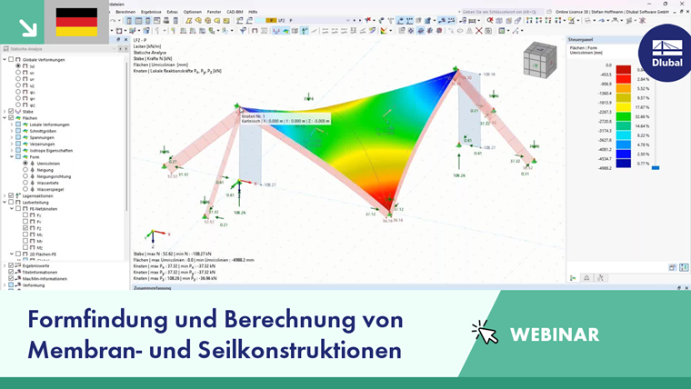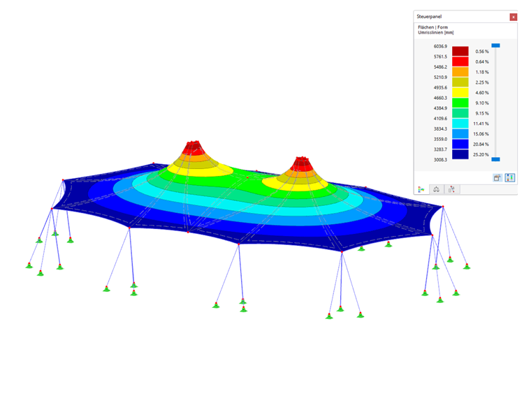 Das Add-On Formfindung sucht eine optimale Form von normalkraftbelasteten Stäben und zugbelasteten Flächenmodellen. Die Form wird dabei über das Gleichgewicht zwischen der Stabnormalkraft bzw. der Membranspannung und den vorhandene Randbedingungen ermittelt.