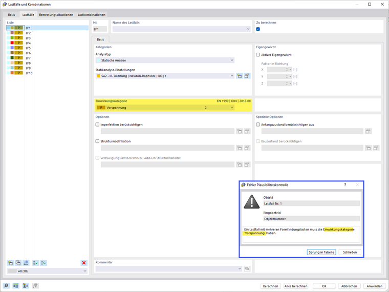 Die Formfindungslasten sind ausschließlichen einem Lastfall mit der Einwirkungskategorie "Vorspannung" zuzuweisen. Sie erhalten sonst eine Fehlermeldung.