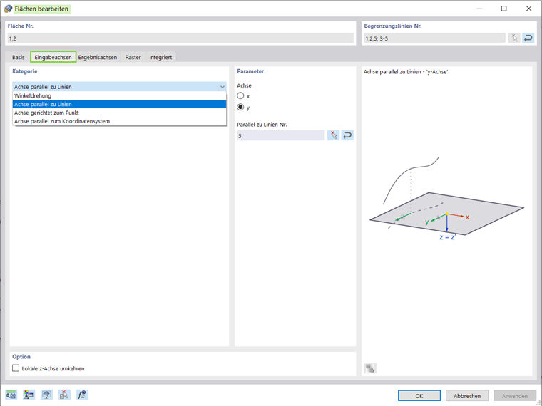 Es ist wichtig zu erwähnen, dass zum Ansatz einer orthotropen Flächenvorspannung das Häkchen bei spezifische Achsen im Dialog Flächen bearbeiten gesetzt werden sollte und die Eingabeparameter der Flächen entsprechend anzupassen sind.