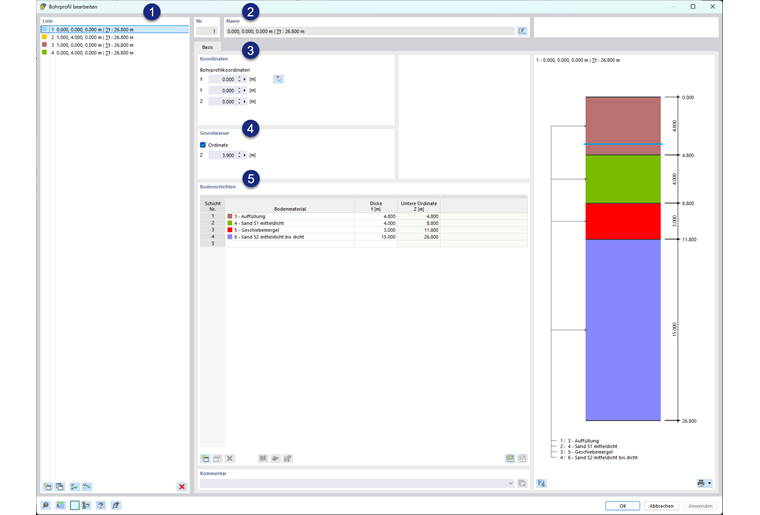 Die Liste des Dialoges enthält alle Bohrprofile, die im vorliegenden Modell erzeugt wurden. Alle weiteren Felder des gesamten Eingabedialoges enthalten die Einträge für die Bohrprofil die aktuell in der Liste angewählt ist.