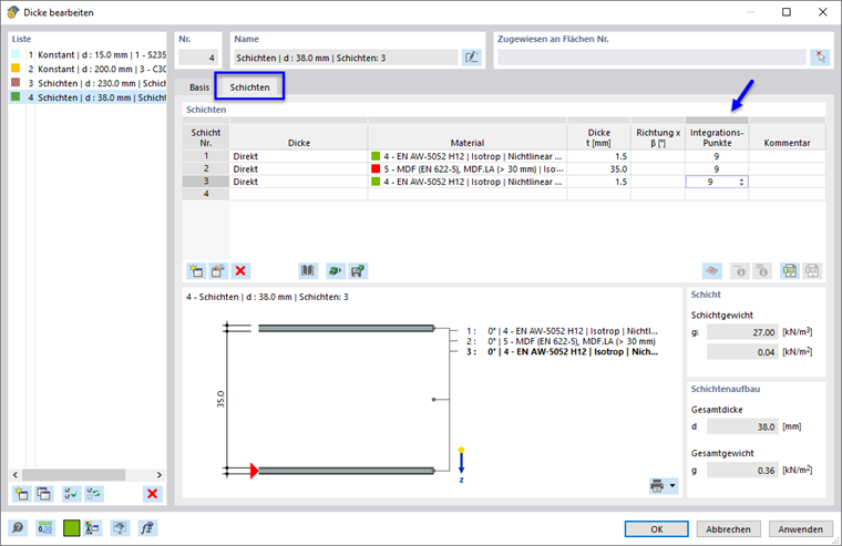 Es sind 3 bis 99 Integrationspunkte über die Höhe möglich. Für jede Schicht können Sie die Anzahl separat festlegen.