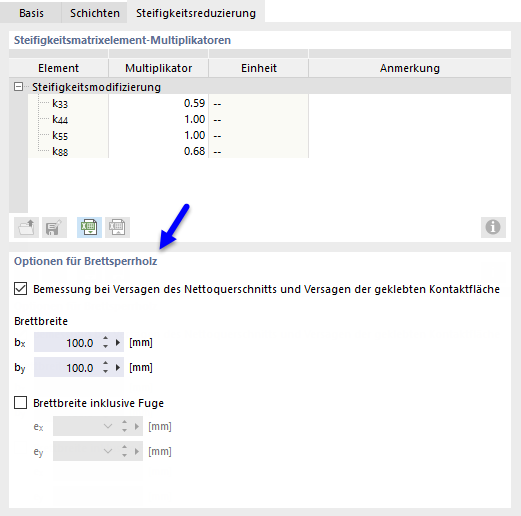 Im Register Steifigkeitsreduzierung des Dicke-Dialogs können Sie über die 'Optionen für Brettsperrholz' die Versagensmechanismen (VM) 1 bis 3 beeinflussen. Diese betreffen die Schubbemessung.