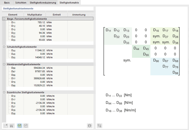 Die Steifigkeitsmatrix des Gesamtaufbaus wird im Register Steifigkeitsmatrix des Dicke-Dialogs angezeigt.
