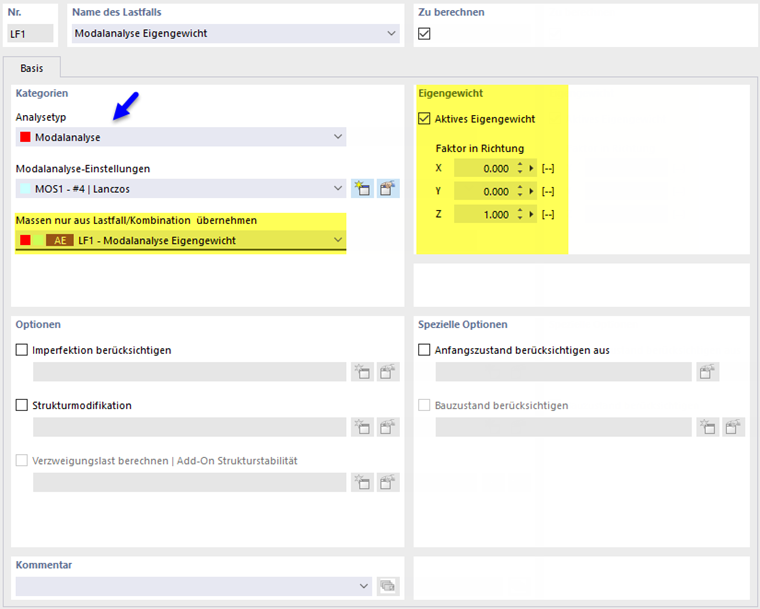 Falls Sie in den Statikanalyse-Einstellungen einen 'Multiplikationsfaktor' für die Belastung festgelegt haben, so wird dieser für die Modalanalyse nicht berücksichtigt. Setzen Sie in diesem Fall den Faktor des Lastfalls in einer manuell definierten Lastkombination an, um die Massen zu skalieren.