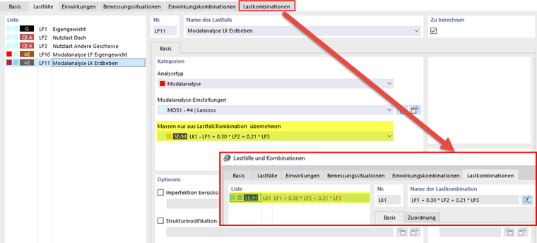 Lastfälle können Sie in einer Bemessungssituation zu einer Erdbeben-/Massenkombination kombinieren (siehe Bild Bemessungssituation 'Erdbeben-/Massenkombination' ).