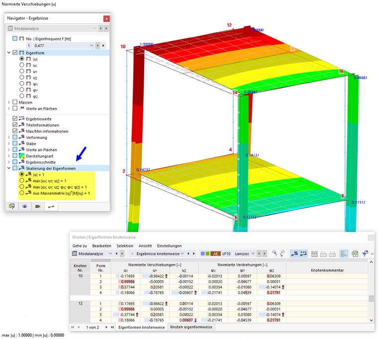 In der Kategorie Skalierung der Eigenformen unten im 'Navigator - Ergebnisse' stehen verschiedene Möglichkeiten zur Auswahl, mit denen Sie die Darstellung der Eigenformen im Arbeitsfenster und in den Tabellen beeinflussen können.