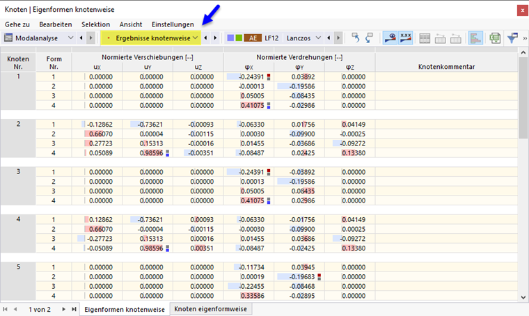Im Register 'Knoten eigenformweise' sind die Ergebnisse der Knoten nach Eigenformen geordnet.