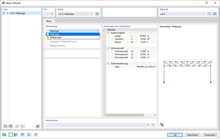 Definieren Sie einen Stabsatz, um die Verwölbung zwischen einzelnen Stäben zu übertragen. Bei Stabsätzen des Typs 'Stabzug' wird die Verwölbung zwischen allen aneinander angeschlossenen Stäben als kontinuierlich angenommen. Die Erstellung von Stabsätzen wird im Kapitel Stabsätze des RFEM-Handbuchs beschrieben.