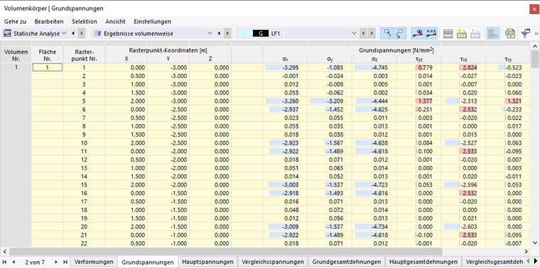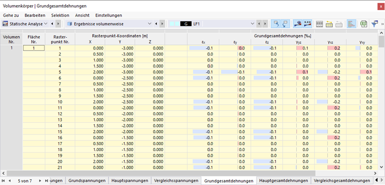 Das Bild Ergebnisse volumenweise in Tabelle zeigt die Tabelle mit den Verformungen der Begrenzungsflächen. Die Verschiebungen und Verdrehungen werden in den Flächen-Rasterpunkten ausgegeben (siehe Kapitel Flächen ).