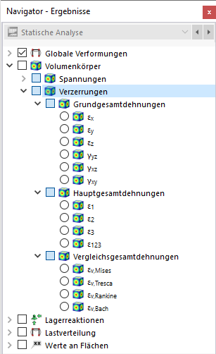 Legen Sie im Navigator fest, welche Verzerrungen an den Begrenzungsflächen der Volumen angezeigt werden sollen. Die Tabelle listet die Dehnungen dieser Flächen nach den Vorgaben auf, die im Ergebnistabellen-Manager festgelegt sind.