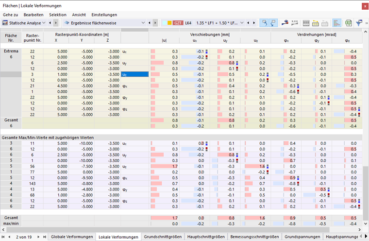 Legen Sie im Navigator fest, welche Verformungen an den Flächen dargestellt werden sollen. Die Tabelle listet die Verformungen einer jeden Fläche nach den Vorgaben auf, die im Ergebnistabellen-Manager festgelegt sind. Dort können Sie auch steuern, welche Extremwerte ausgegeben werden.