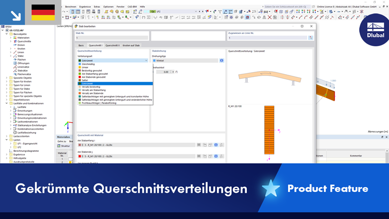 Die Querschnittsverteilung regelt den Verlauf des Querschnitts entlang des Stabes. Mit der Voreinstellung 'Gleichmäßig' wird ein konstanter Verlauf über die gesamte Stablänge angenommen. Für eine gevoutete Verteilung oder abschnittsweise veränderliche Verläufe bietet die Liste verschiedene Möglichkeiten zur Auswahl.