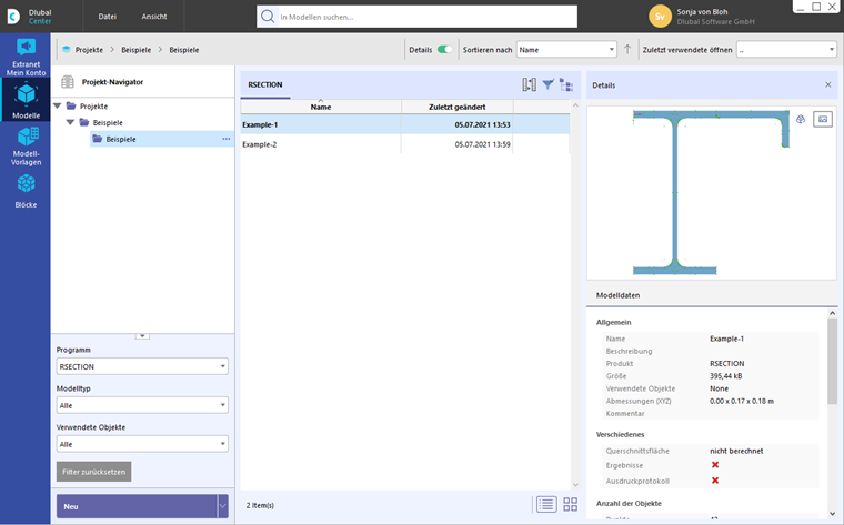 Das Dlubal Center organisiert Ihre Projekte und Modelldateien, Vorlagen (Mustermodelle) und Blöcke (Modellbausteine). Im Dlubal Center können Sie auch Ihre Kundendaten und die erworbenen Lizenzen einsehen.