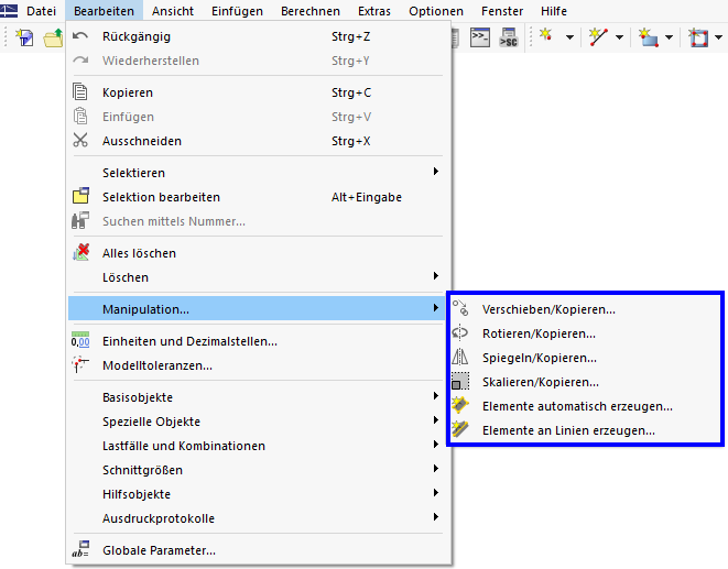 Die Objekte sind zunächst mit einer der im Kapitel Selektionsoptionen beschriebenen Möglichkeiten zu selektieren bevor die Funktionen Verschieben/Kopieren, Rotieren/Kopieren, Spiegeln/Kopieren,Skalieren/Kopieren oder Polylinie in Linie zerlegen angewendet werden können. Für die anderen Modellierungstools ist keine vorherige Selektion der Objekte notwendig.