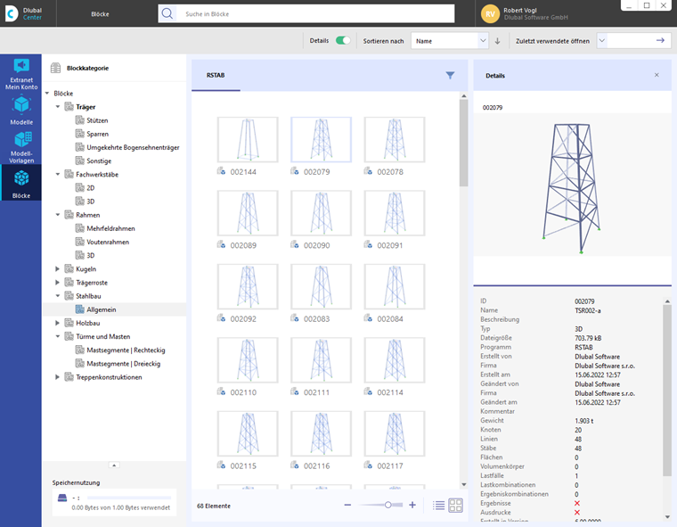 Die Kategorie Blöcke im Dlubal Center bietet eine Übersicht über die Modellbausteine, die Sie als Muster gespeichert haben. Bei der Installation wurde bereits eine Vielzahl typisierter Elemente bereitgestellt.